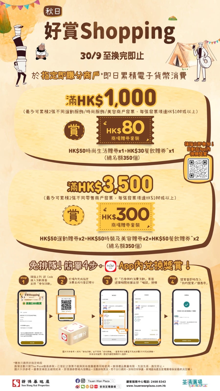 The Point会员于荃湾广场内「指定即赚分商户」即日以电子货币累积消费满指定金额,即可在The Point App轻松换领奖赏!